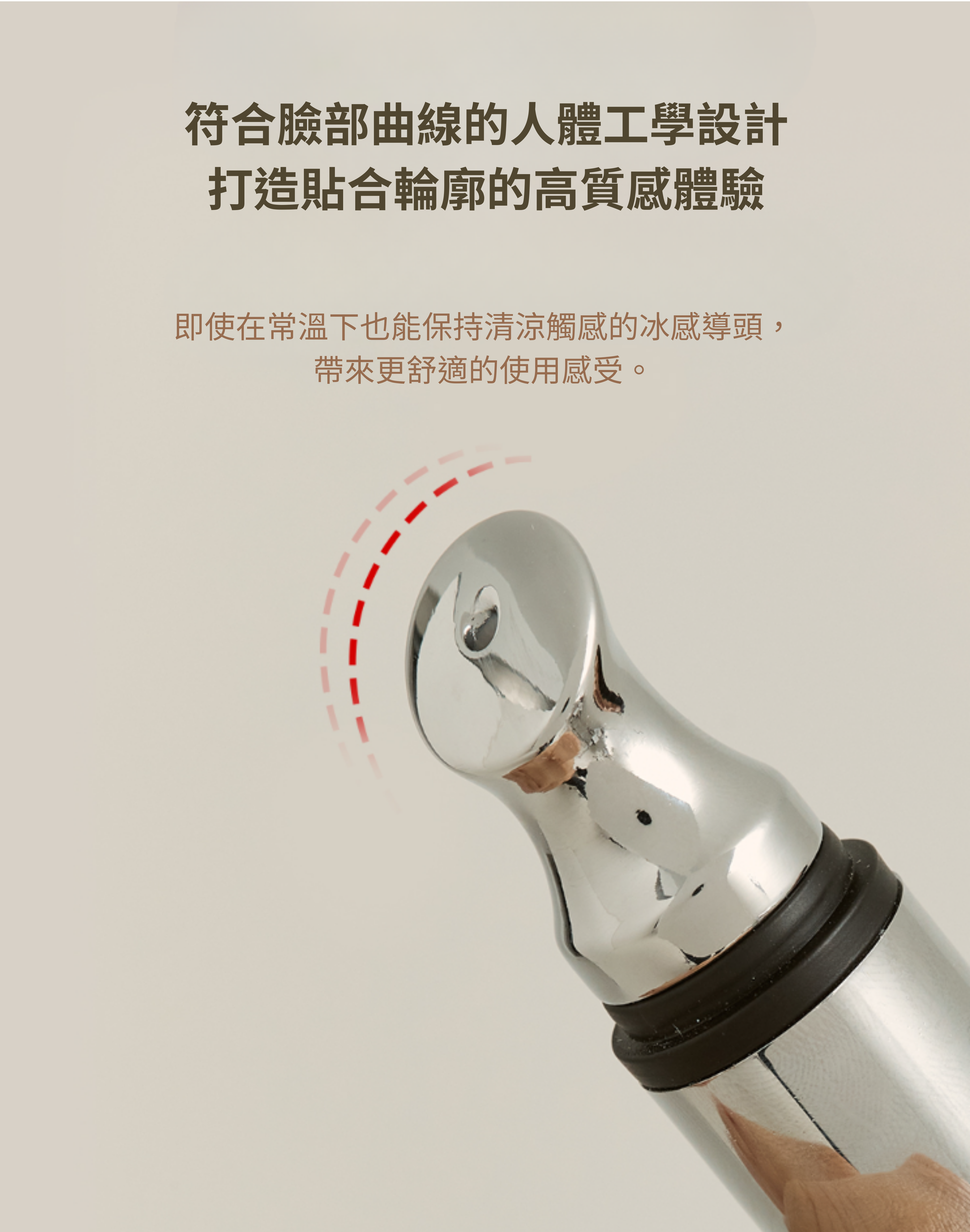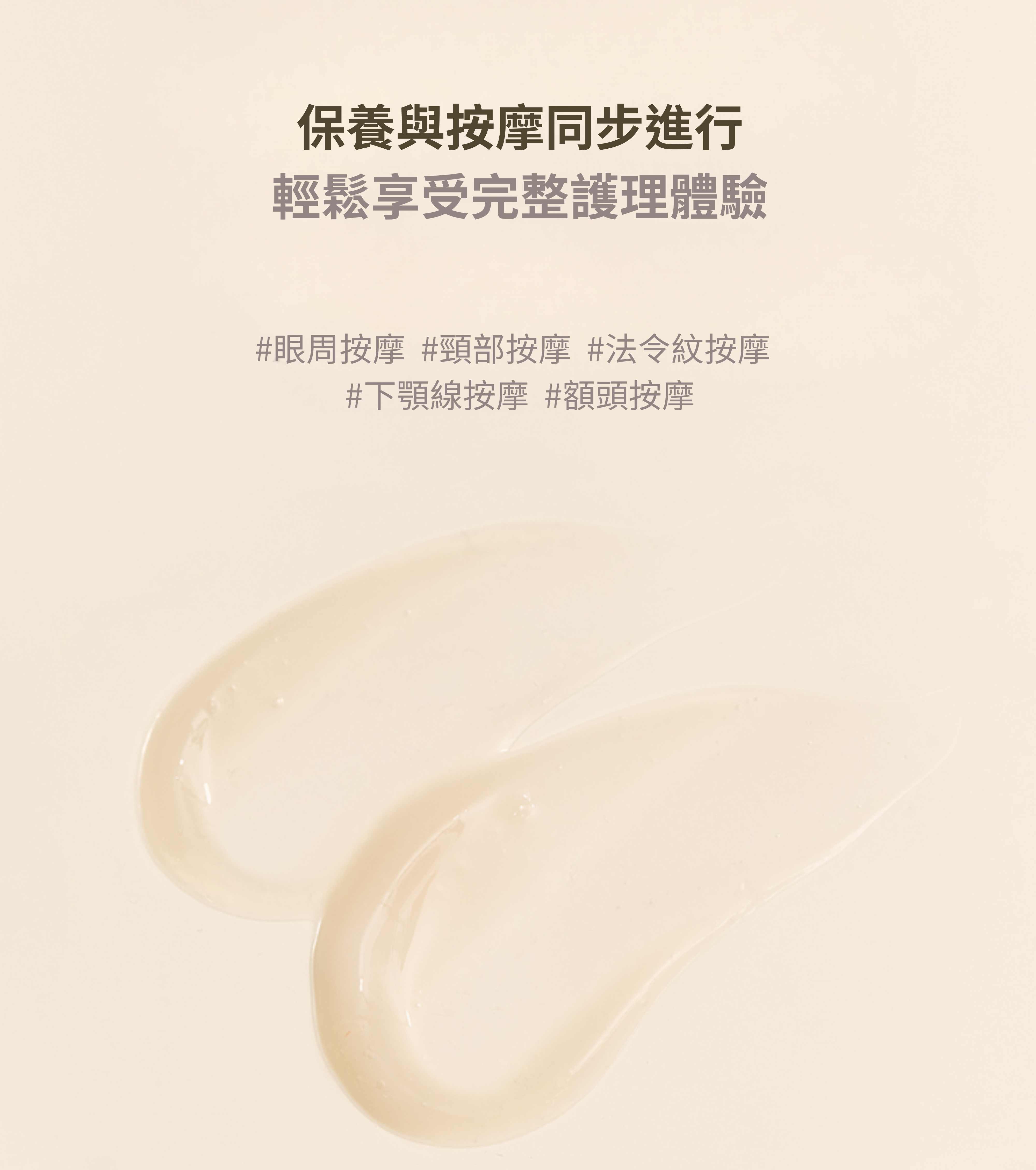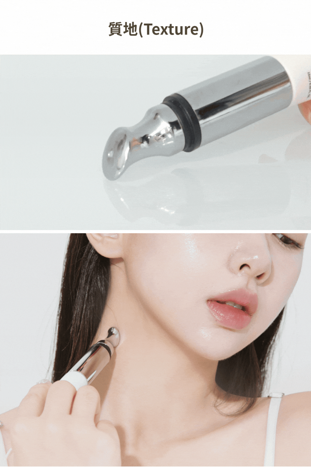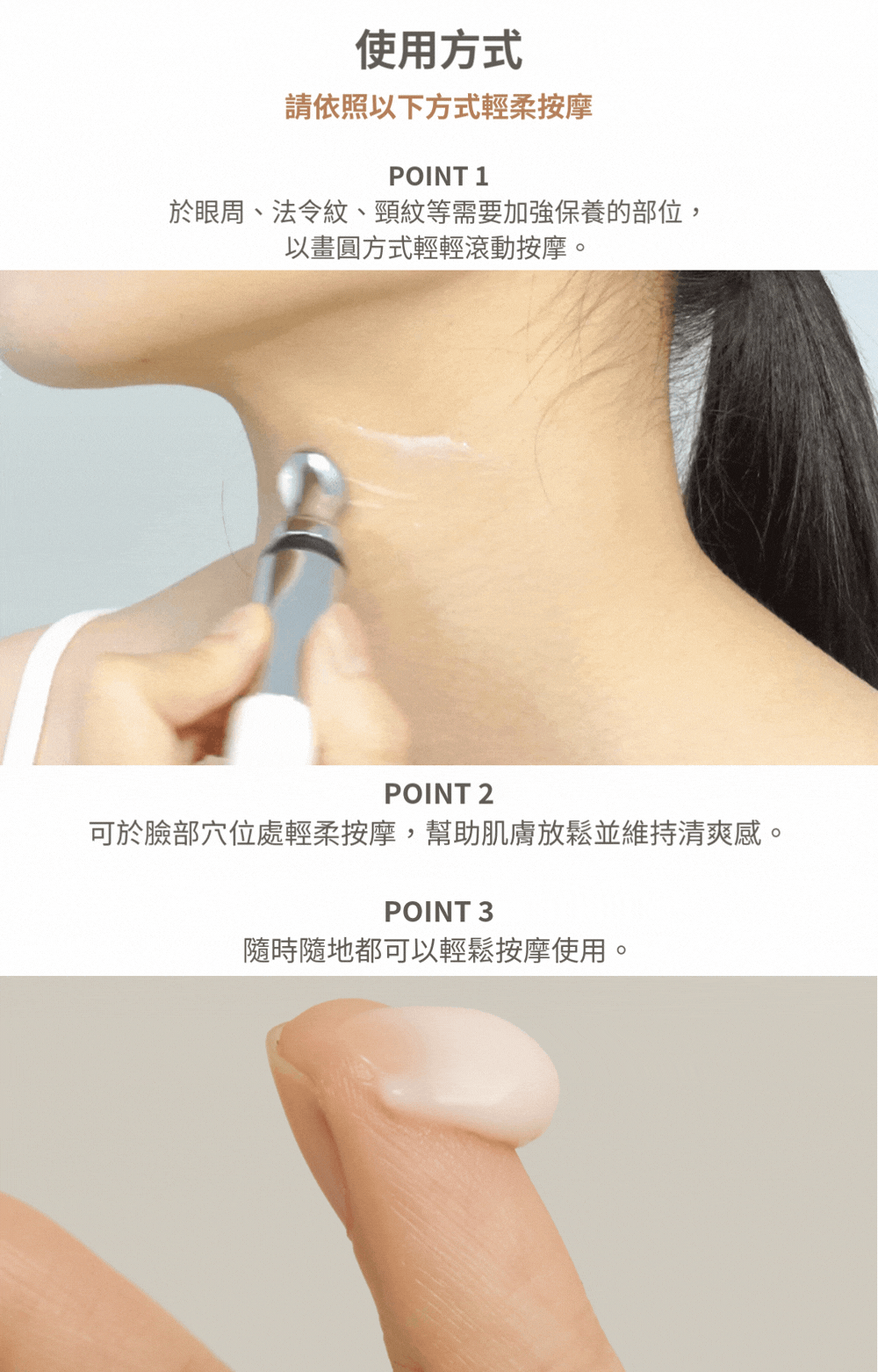 請於眼周、法令紋及頸紋等需要保養的部位,以畫圓方式輕柔滾動按摩,也可在臉部穴位處輕輕按摩,幫助肌膚放鬆、維持清爽感,隨時隨地都能輕鬆使用。