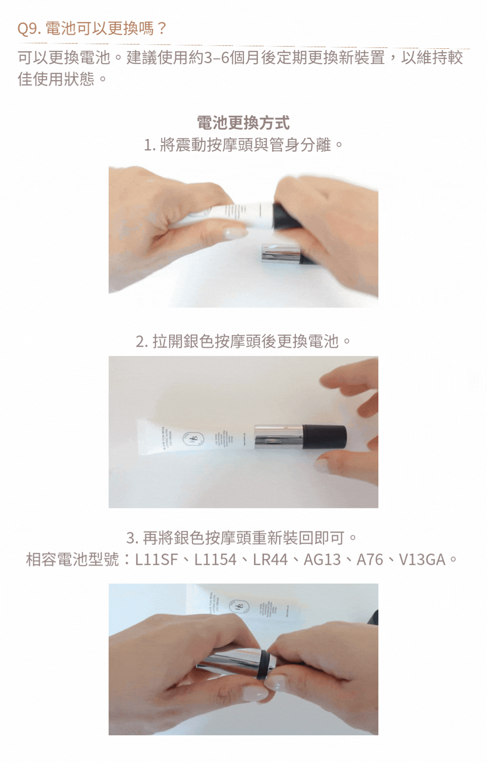 2.使用前請注意確認皮膚有無異常,有傷口、腫脹、濕疹、皮疹、疼痛等症狀時請勿使用。