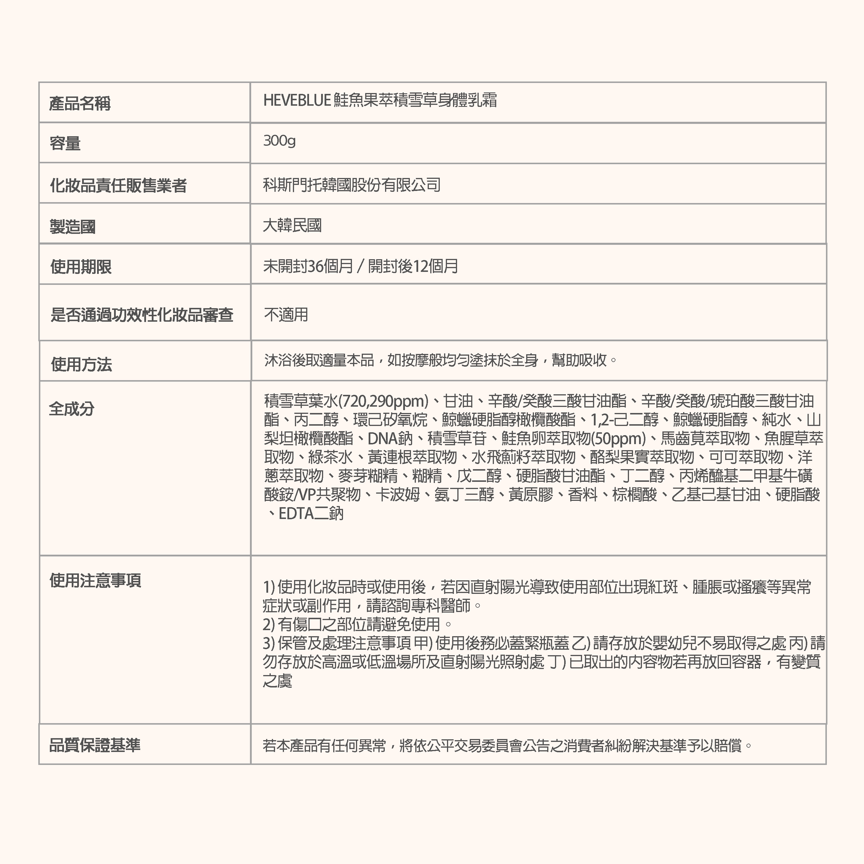 HEVEBLUE鮭魚果萃積雪草身體乳霜