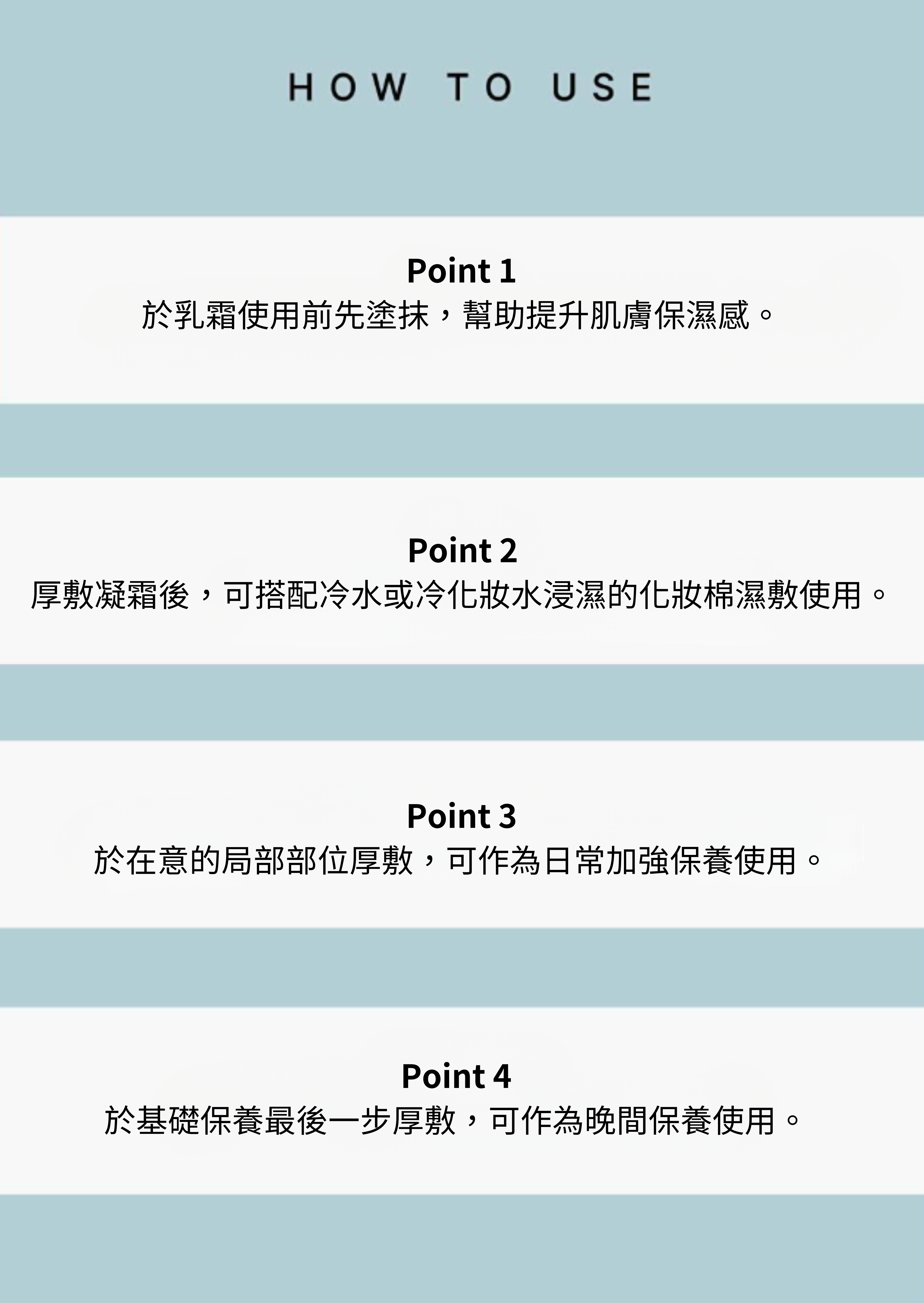 於乳霜前使用以提升肌膚保濕感;也可厚敷後搭配冷水或冷化妝水浸濕的化妝棉濕敷使用;或於在意部位加強厚敷作日常保養;亦可於保養最後一步厚敷,作為晚間保養使用。