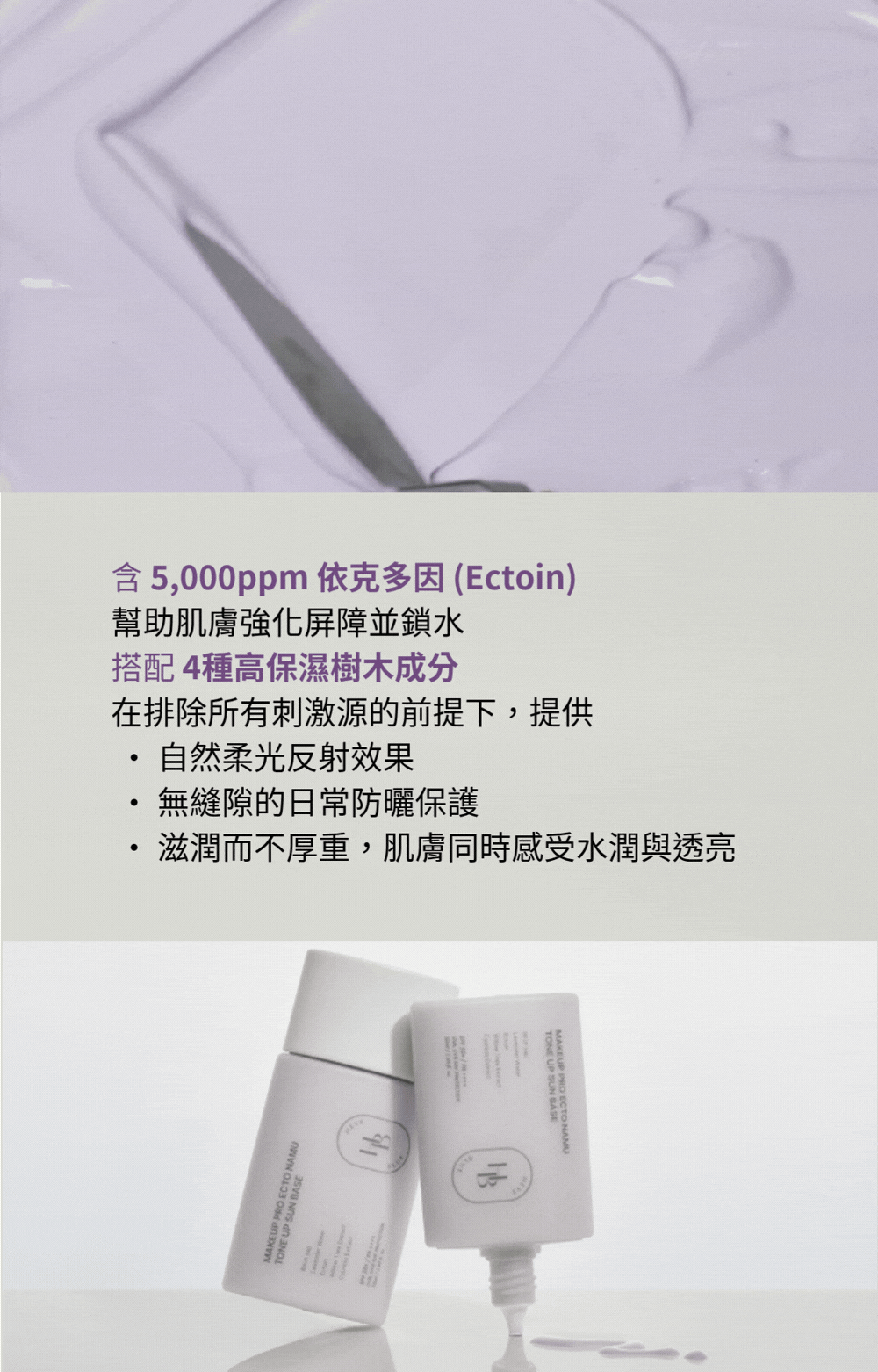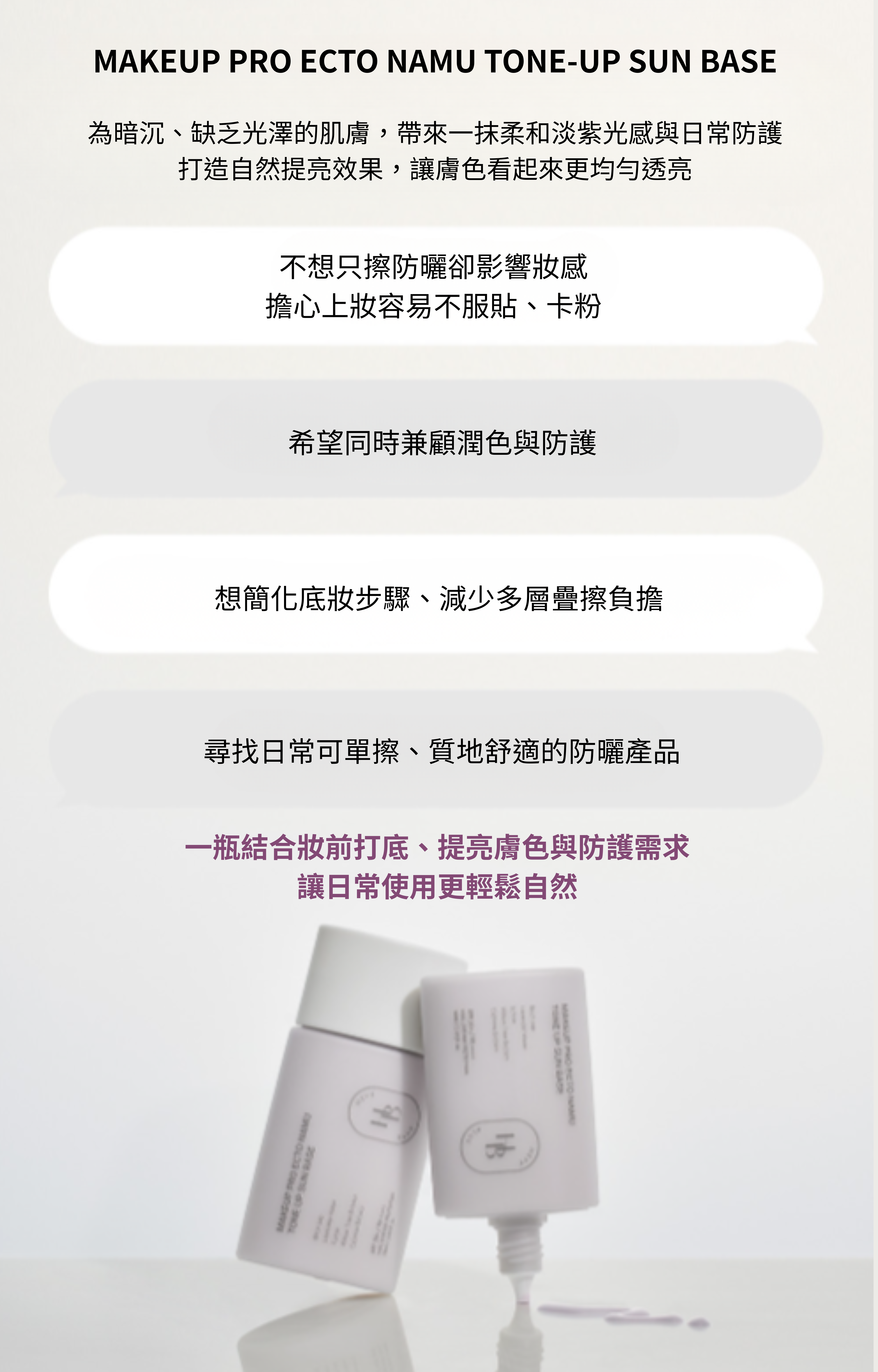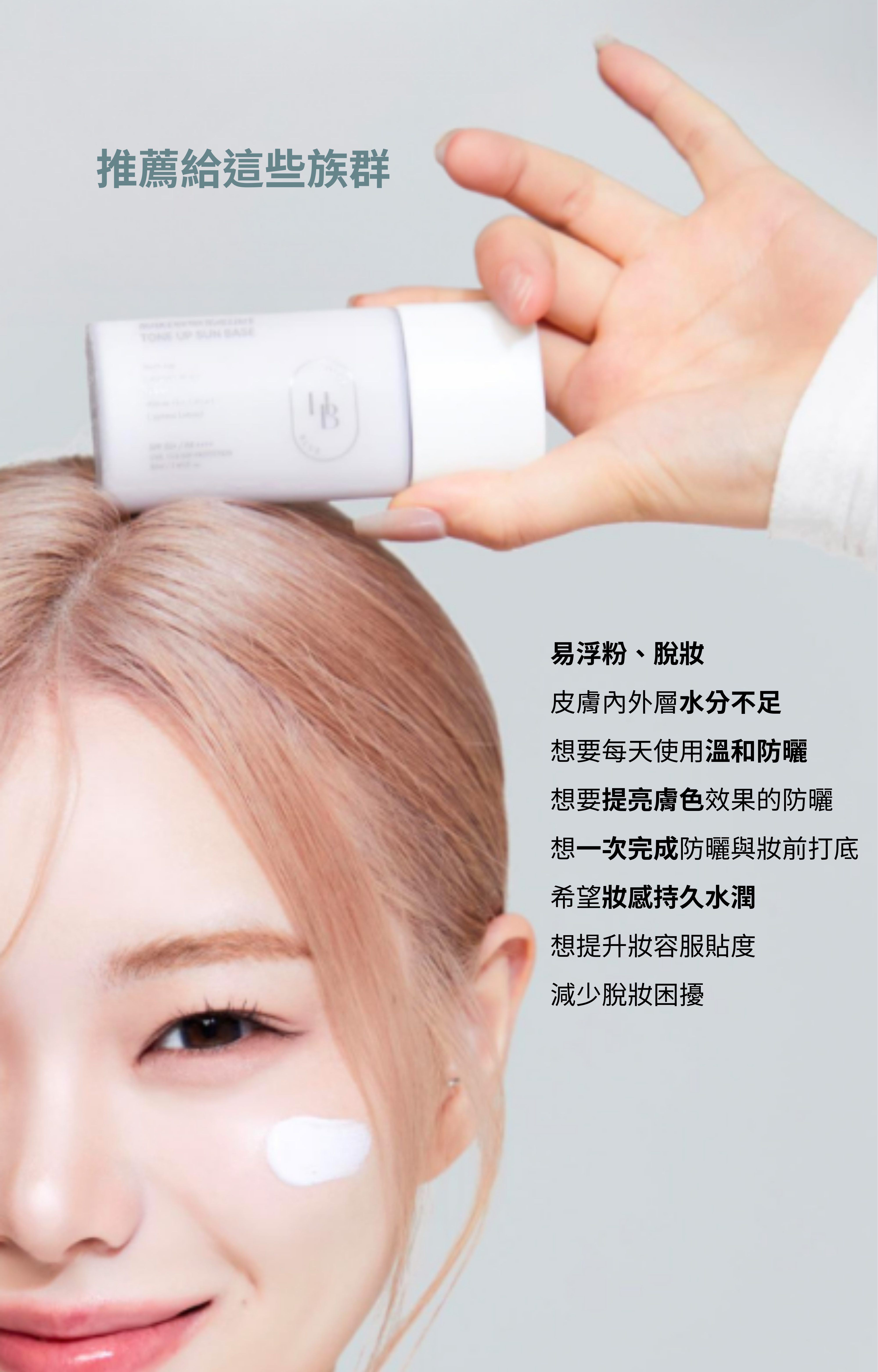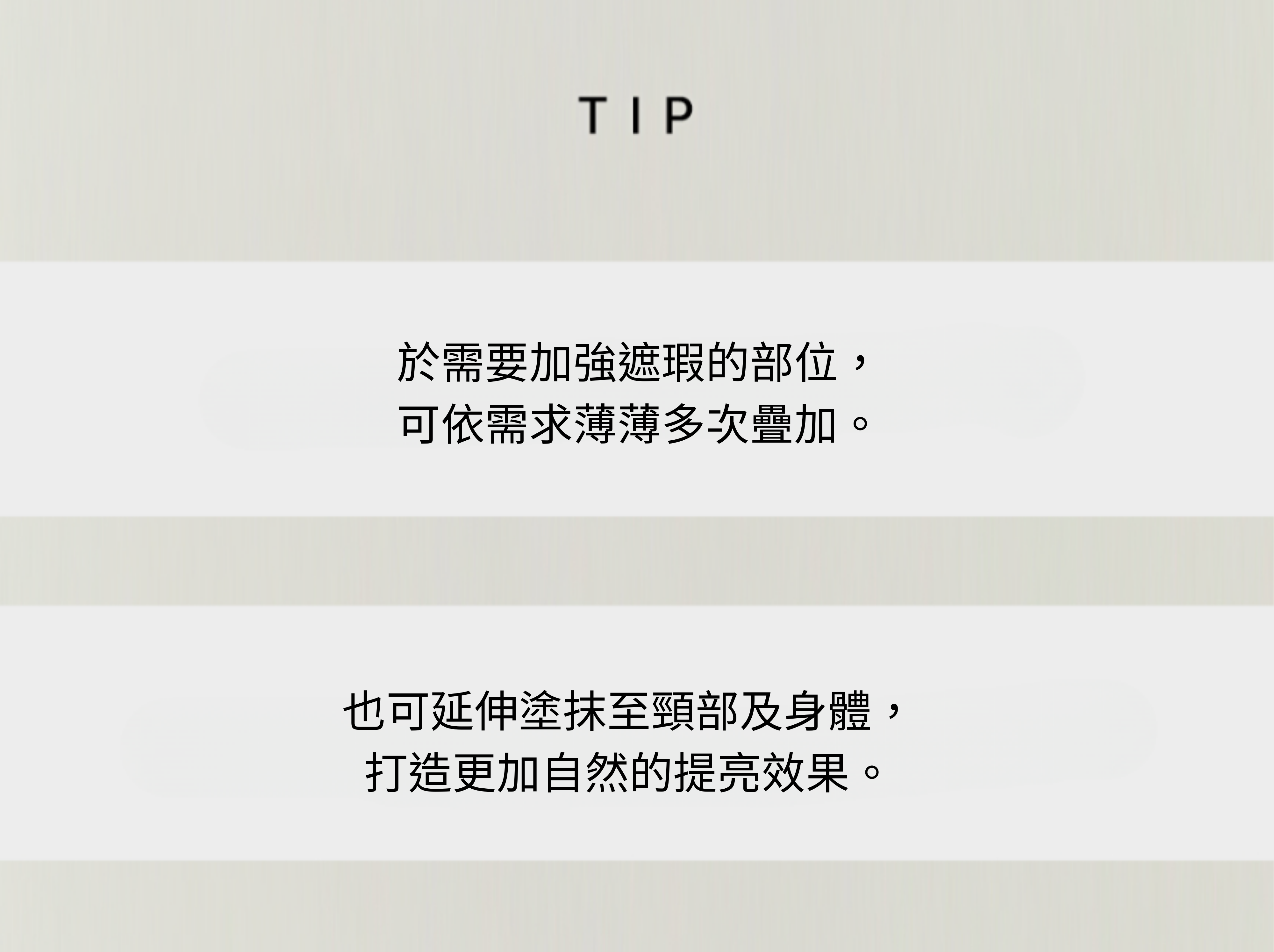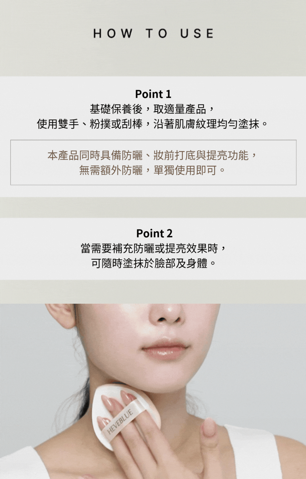 取適量產品,用手、粉撲或刮棒沿肌膚紋理均勻塗抹,本品兼具防曬、妝前打底與提亮功能,單用即可;需要時可隨時補塗於臉部、頸部及身體,必要時薄薄疊加加強遮瑕,打造自然透亮膚色。
